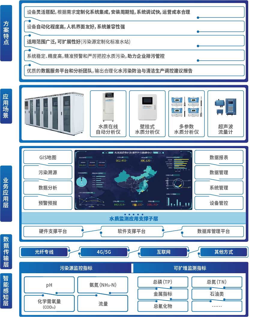 污染源水質自動監(jiān)測系統(tǒng)以在線自動分析儀器為核心,運用現(xiàn)代傳感技術、自動測量技術、自動控制技術、計算機應用技術以及相關的專用分析軟件和通信網(wǎng)絡組成的綜合性在線自動監(jiān)測系統(tǒng)。監(jiān)測數(shù)據(jù)實時上傳至水質自動監(jiān)測實時聯(lián)網(wǎng)預警監(jiān)控系統(tǒng)??蓪崿F(xiàn)對水質多項指標的實時自動監(jiān)測和遠程監(jiān)控,及時掌握污染源水質狀況,確保水質穩(wěn)定達標。