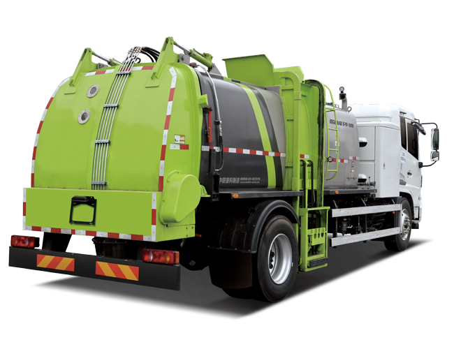可由液壓馬達(dá)驅(qū)動的高壓力、小流量的水泵清洗垃圾箱、提桶機(jī)構(gòu)、垃圾桶以及整車;